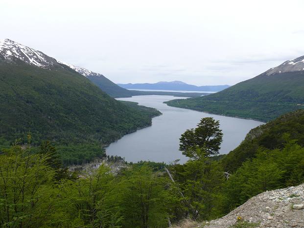 In ständigem Auf und Ab ging es mehr oder weniger dem Lago Fagnano entlang, immer wieder den Wind im Gesicht. Nach 40 Kilometer kam endlich die lang ersehnte Kurve, und 5 Kilometer später erreichte ich den Lago Escondido. Das war dann auch der Einstieg zum anspruchvollsten Teil der heutigen Etappe, da es nun zum Paso Garibaldi hinaufging. Dabei kam die Schneefallgrenze auf der gegenüberliegenden Bergflanke immer mehr auf Augenhöhe,,, Es gab aber immer wieder herrliche Ausblicke hinunter auf den Lago Escondido und den Lago Fagnano. Auf der Passhöhe hängte ich dann für die folgenden Kilometer wieder mal die Hinterradbremse ein und genoss die Abfahrt.