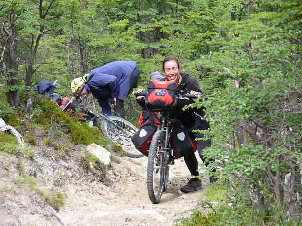 Den See erreichte ich dann mehr als 1 Stunde bevor das Schiff planmässig ablegt. Bald gesellten sich auch Jess und Jules aus Australien mit ihren Bikes dazu, die gestern von El Chaltén herfuhren und campierten. Später kamen dann auch noch ein paar “normale” Touristen, wobei der Bus mit 90 Minuten Fahrzeit nur doppelt so schnell war wie ich… Die Crew tauchte dann auch mal auf, und irgendwann nach 11 Uhr starteten wir die Fahrt über den See. Auf der anderen Seite liessen wir uns die Ausreise aus Argentinien in den Pass stempeln, und kurz nach 12 Uhr machten wir uns ans Herzstück dieser Etappe. Es verblieben noch 4 Kilometer auf argentinischem Boden – und die hatten es wahrlich in sich! Radfahren war da nicht mehr möglich, sondern nur noch laufen und schieben. Da auf dem Waldpfad auch Personen und Gepäck mit Pferden transportiert werden, ist dieser manchmal sehr tief und schmal, so dass ich schon beim Zoll die Vorderradtaschen an Oberrohr und Lenker hängte. Es ging dann gleich brutal steil los – und als ich so das Velo im Graben unten hatte und ich fast auf Lenkerhöhe! lief, hängten auch die Hinterradtaschen an. Die ersten beiden Steilstücke riss ich so das Fahrrad noch durch, doch das war sehr zeit- und kraftraubend. Also musste eine neue Packtechnik her! Ich entfernte eine der Taschen und band sie auf die schwarze Packtasche. Doch so kam ich nicht weit, denn das Gepäck war sehr instabil und rutschte seitlich hinunter. Nach weiteren Mühen fand ich dann die ultimative Lösung, um vorwärts zu kommen: Die schwarze Packtasche band ich längs auf den Gepäcksträger, und die linke Hinterradtasche hängte ich über die rechte und fixierte sie an der schwarzen Tasche. So kam ich besser voran, und die beiden Australier werde ich wohl morgen beim Warten aufs Schiff wieder sehen…