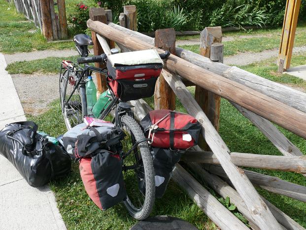 Dafür flog ich beim Anfahren wieder vom Rad – und dabei brach mir die zweite untere Halteschraube. Damit wurde der Gepäcksträger nutzlos, da er kein Gewicht mehr tragen konnte. Ich band zuerst die Seitentaschen ans Oberrohr, hängte die schwarze Tasche an den Rücken und schob – doch irgendwie war das keine befriedigende Lösung... Nach wenigen Metern band ich dann alle Seitentaschen am Vorderrad fest und fuhr mit der schwarzen Tasche am Rücken die letzten 10 Kilometer nach Cochrane. Glücklicherweise ging es zumeist bergab, so dass ich nur rollen konnte – bzw. bremsen, denn die Wellblechpiste liess nur tiefe Geschwindigkeiten zu. In Cochrane musste ich dann feststellen, dass ich auch ohne Gepäck eine weitere Schraube verloren habe.
