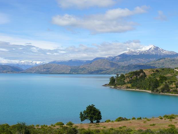 Nach 4 Kilometern Schüttelfahrt wurde der Belag deutlich spürbar besser, so dass ich die 45 Kilometer bis Puerto Río Tranquilo nicht die ganze Zeit eine einigermassen fahrbare Spur suchen musste. Stattdessen konnte ich das herrliche Wetter und die fantastischen Ausblicke über den Lago General Carrera und die Berge geniessen. Belästigt wurde ich dabei nur von Riesen-Bremsen. Ihre Grösse war aber auch ihr Verderben, denn ich spürte dadurch jede Landung und konnte alle totschlagen, bevor sie stechen konnten. Allerdings hatte ich das Gefühl, gegen eine Hydra anzukämpfen: hatte ich eine erlegt, kamen zwei neue hinzu...
