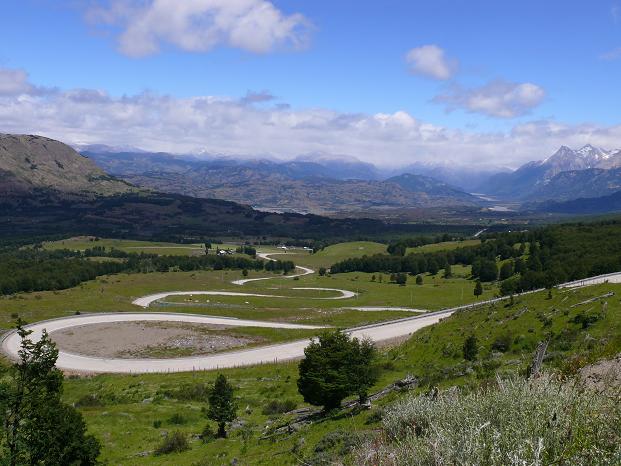 Auch das letzte Stück nach Coyhaique hatte es in sich: nach wenigen Metern fuhr ich um einen Berghang herum, und eine steife Brise wehte mir entgegen. Da war ich froh, dass ich gestern nicht weitergefahren bin, denn sonst hätte ich wohl kaum eine so ruhige Nacht verbracht. Da der Wind auch extrem kalt war, nutzte auch der Sonnenschein wenig, und ich schützte mich mit dem Regenschutz. Da ich die Handschuhe schon länger zuunterst in einer Packtasche verstaut habe, zog ich dann wenigstens die ärmel über die klammen Finger.
