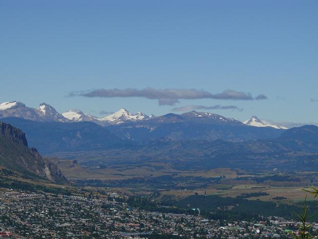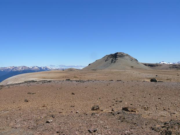 Der Wanderweg war nun mit Holzpfählen signalisiert, wobei es nach dem grossen Plateau an der Flanke vom höheren Gipfel entlangging, um dann andere Höhepunkte zu erreichen. Der letzte Gipfel war dann der höchste Punkt auf der Tour, und ich hatte einfach eine fantastische Aussicht auf die Umgebung! Und der Pass mit den Windrädern, den ich beim Verlassen von Coyhaique zu überqueren habe, sieht von hier oben lächerlich klein aus...