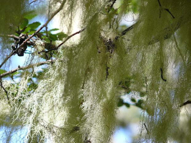 Auf der ganzen Schlaufe bereute ich nie, den weiteren Weg gewählt zu haben, denn es war einfach eine Pracht! Durch dichten Wald ging es einmal an einer Felswand vorbei, wo ein kleiner Wasserfall herunterplätscherte. Dann kam eine ganz eigenartige Sektion, wo die Bäume mit einem hellgrünen Organismus bedeckt sind, die überall wie Flechten herumhängen. Als ich unten im Tal den Ranger dazu befragte, meinte er, dass diese durch den Wind transportiert werden und unschädlich seien. Nun, die Bäume hatten nur noch ganz zuoberst in der Krone Blätter und der Wald war lichter als anderswo...
