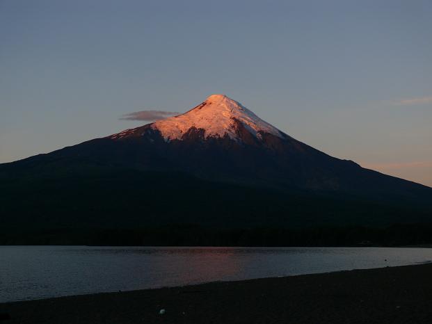 Eigentlich hatte ich vor, eine Nacht in Peulla zu verbringen und erst morgen die letzte Schiffspassage über den Lago Todos los Santos nach Petrohué zu bewältigen. Da es aber wunderschönstes Wetter war, habe ich dann die heutige Etappe verlängert – wäre ja schade, wenn ich morgen dann bei schlechtem Wetter (man weiss ja nie!) die herrlichen Ausblicke auf die Berge und Vulkane um den See herum verpasst hätte! Ab Petrohué waren es dann noch 16 Kilometer nach Ensenada, wo ich ja schon vor 2 Wochen übernachtete. Das Hospedaje, wo ich damals logierte, war bereits voll, aber ein Haus weiter habe ich dann im nächsten Hospedaje ein Zimmer bekommen. So ging ich dann schnurstracks unter die Dusche, denn es war ja schon beinahe 20 Uhr, und ging dann ins selbe Restaurant wie vor 2 Wochen. Diesmal hatte ich die Kamera dabei, so dass ich diesmal vom glühenden Osorno Fotos schiessen konnte. Keine Angst, der Vulkan Osorno glühte nicht, weil er auszubrechen drohte, sondern wegen dem Sonnenuntergang, welcher die Eiskappe rötlich färbte.