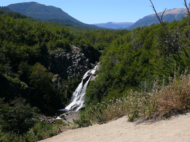 Die ersten 20 Kilometer waren noch flach dem Lago Puyehue entlang, wo ich noch richtig Tempo bolzen konne. Dann ging es zwar weiterhin dem See entlang, doch es waren immer wieder längere Steigungen zu erklimmen. Auch als ich dann den See hinter mir gelassen hatte, hatte es immer wieder kleine Abfahrten drin, auf denen ich die erarbeiteten Höhenmeter wieder hergeben musste. Immerhin hatte ich bei der Mittagspause nach 45 Kilometern einen feinen Ausblick auf den Salto de Novios, wo das Wasser über die Felsen hinunterstürzte.