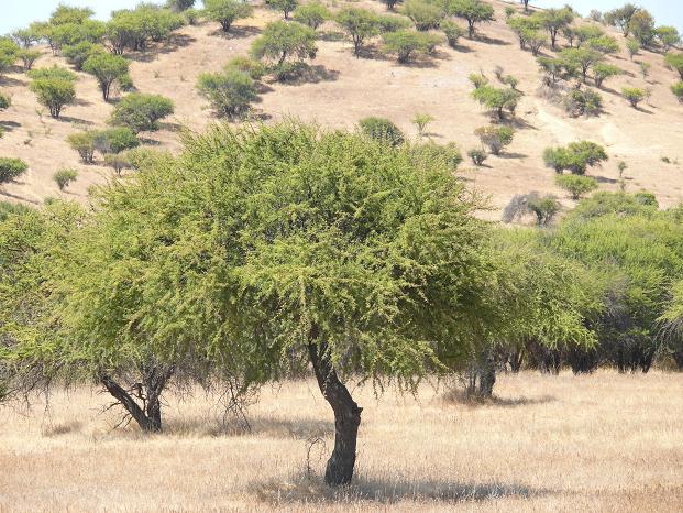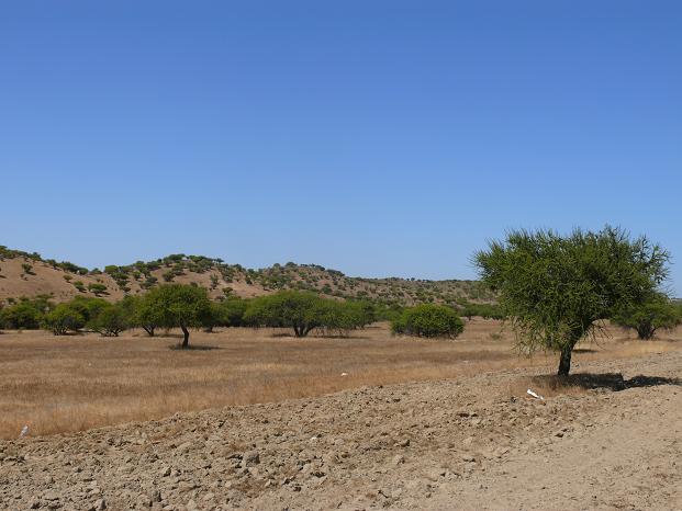 Ich bekam aber zu spüren, dass ich in den Nachmittag hineinfuhr (Frühstück gab es erst ab 08.30 Uhr), denn in der gleissenden Sonne verdunstete das Wasser, bevor es die Kehle erreichte… Entsprechend trocken und karg ist auch die Landschaft, wobei die Hügel zuweilen auch mit niedrigen, alleinstehenden Bäumen übersät sind.