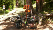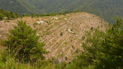 Was für ein Unterschied zur Situation vor 2 Tagen, als ich letztmals im Zelt übernachtete: Da schloss ich jede Öffnung, um ein bisschen Wärme im Zelt zu halten, während ich letzte kaum wusste, wie ich die Hitze aus dem Zelt rausbringe! Wie üblich kurz nach 8 Uhr fuhr ich los, ohne Anlauf direkt den Berg hinauf. In Roquebillière musste ich genau schauen, um den Abzweiger Richtung Granges-de-la-Brasque nicht zu verpassen. Und dann stand da "Piste à Granges-de-la-Brasque". "Piste", nicht "Route". Den Grund dafür erfuhr ich 2 Kilometer später, als ich schon viele Höhenmeter weiter oben war und das Teerband unvermittelt endete. Auf Naturstrasse einen Berg hochzufahren ist dann natürlich noch anspruchsvoller! Ich nahm die Herausforderung an und pedalte die Serpentinen hoch - bis ich etwa in der Hälfte infolge Steilheit und losem Schotter das erste Mal schieben musste und in ein psychisches Loch fiel. Soll ich mich da wirklich hochquälen, oder wäre es nicht gescheiter, runterzurollen und aussenrum zu fahren? Nach einer Bedenk-, Verschnauf- und Essenspause sagte ich mir: Komm, einen Kilometer machst Du noch, es bleibt auch dann genügend Zeit, aussenrum zu fahren. Und so machte ich auch den nächsten Kilometer, und den nächsten, und den nächsten... Ich musste zwar immer öfter schieben, aber dafür wurde ich auch mit fantastischen Aussichten belohnt, so dass ich bald wieder guten Mutes war und es mir eigentlich ziemlich egal war, wie lange ich bis zum Gipfel benötige. Nur dass ich dann auf der Abfahrt auf der Schotterstrasse auch nicht schnell unterwegs sein kann, bereitete mir ein bisschen Sorgen. Nach 16 Kilometern (statt der auf der Karte angegebenen 13) erreichte ich dann Granges-de-la-Brasque, wo früher wohl militärische Aktivitäten stattgefunden hatten. Und da gab es gleich zwei positive Überraschungen: meine Räder rollten wieder über Asphalt, und zum Gipfel vom Col d'Andrion ging es die verbleibenden 2 Kilometer tatsächlich ziemlich flach dahin, so dass ich dann doch noch vor 13 Uhr oben ankam. Die Abfahrt genoss ich dann in vollen Zügen, wobei ich auf der schmalen Strasse mit schlechtem Belag (aber immer noch viiiiel besser als ohne!) und ohne Leitplanken alle Vorsicht walten liess. Immerhin musste ich die Strasse mit kaum jemandem teilen; Nachdem es gestern am Col de Turini schon kaum Verkehr hatte, begegnete ich auf der Naturstrasse hinauf nach Granges-de-la-Brasque genau einem Motorrad, 2 Pkw, 2 Buggy und einem Langholz-Lkw. Auf der Abfahrt bis La Tour wurde das mit 3 Pkw noch unterboten... Auf der Abfahrt musste ich mal mehrmals an einen Hang schauen, denn ich traute kaum meinen Augen. Waren die Inkas auch in Südfrankreich? Machu Picchu in den Alpen? Jedenfalls wurde mal der ganze Hang mit steinernen Terassen urban gemacht. Eine heikle Situation gab es dann noch auf der weiteren Abfahrt nach La Tour, als ich aus dem Augenwinkel schräg links vor mir einen schwarzen Punkt wahrnahm - und Päng, traf mich das Insekt mitten auf der Brust! Und irgendwie schaffte dieses Ding es noch, seinen Arsch zu positionieren, als es abprallte und am Hals vorbeigeschleudert wurde! Ich hielt sofort an, Stachel konnte ich aber keinen finden. Beim Weiterfahren verschaffte mir dann der Fahrtwind ein bisschen Kühlung an der Kontaktstelle, aber man sieht schon, wo der Stachel am Hals eingeschlagen hat! Unten im Tal konnte ich die Vor- und Nachteile der Windrichtung ausloten. Zuerst ging es 5 Kilometer leicht bergab im kühlenden aber stark bremsenden Gegenwind voran, dann trieb mich der Rückenwind die letzten 17 Kilometer nach Touët-sur-Var leicht bergauf, wobei auch die Temperatur schwindelerregende Bereiche erreichte. Nun, ich bevorzuge trotzdem Letzteres, denn dann kommt man vorwärts, auch wenn man sich immer wieder mit Wasser übergiessen und in den Schatten liegen muss! In Touët-sur-Var rollte ich dann schnurstracks auf den Campingplatz und wollte danach noch Getränke und Verpflegung im Dorf kaufen. Aber nichts da, das Dorf ist tod, die beiden Bäckereien haben geschlossen, und der Kiosk sowie der Metzger haben auch keine Getränke! So muss ich mich doch mit der äusserst kleinen Auswahl im Campingladen zufrieden geben. |